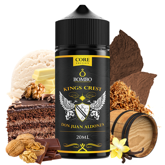 El aroma Don Juan Aldonza de Kings Crest Core Edition & Bombo Core Edition en formato Longfill, une Don Juan Reserve y Aldonza Reserva: una tarta de chocolate con galletas, mantequilla de nueces pecanas, crema batida y notas de tabaco con vainilla envejecido en barrica de roble.